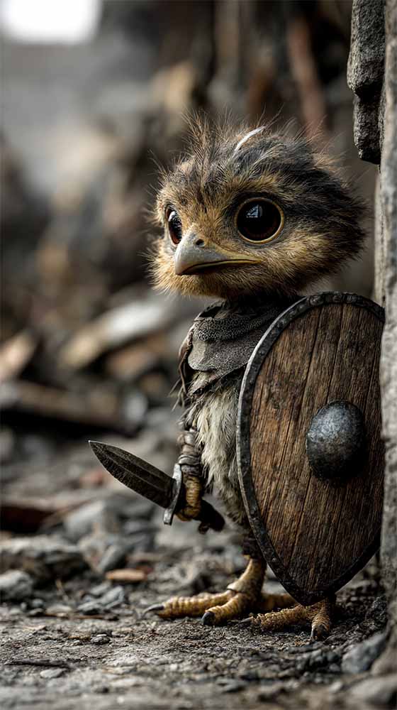 In a land turned grey by a long drought, a legend speaks of a single, magical seed that can bring life back to the parched earth. Corvus, a young bird warrior with a heart full of hope, embarks on a perilous quest to find this lost seed. Guided by ancient maps whispered on the wind, and facing challenges much bigger than himself, Corvus uses his wit and kindness to gain allies along the way. His small sword and wooden shield (as depicted) become symbols of his unwavering determination. He eventually finds the seed, not through might, but by helping a forgotten community of field mice, who in return, reveal its hiding place.