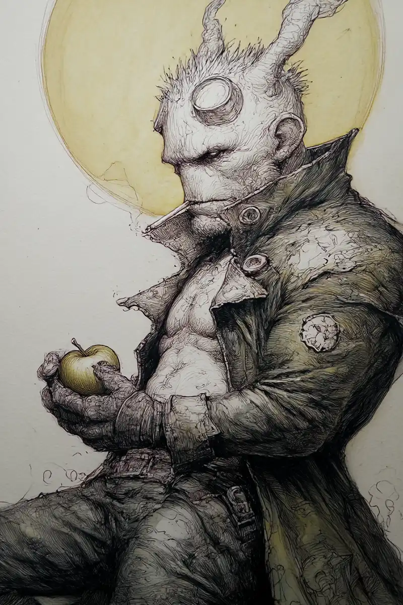 In a desolate, post-apocalyptic world where mutated creatures roam, the figure in the image is the sole guardian of a single, miraculously surviving apple tree. He is burdened by profound loneliness, the last of his kind, his only companions the rustling leaves and the memory of a lost civilization. The apple represents a forbidden hope, a taste of a past he can barely recall.